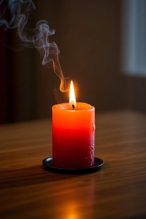 AI Generated. Flickering candle flame on a dark reflective surface creates a serene atmosphere during a quiet evening