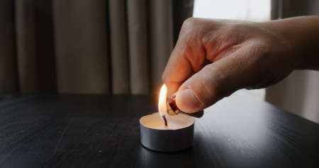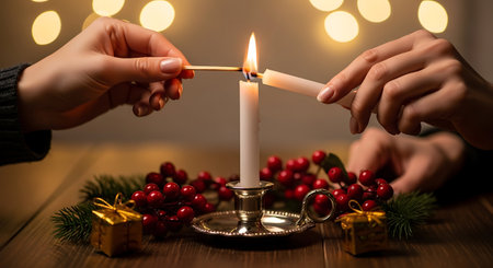 A close-up view captures hands striking a match to light the wick of a white pillar candle in a dimly lit room. The image evokes feelings of warmth, hope, celebration, or a spiritual moment of prayer and reflection.