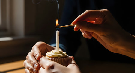 Close-up of hands striking a match to light a single candle on a vanilla cupcake. The scene is dramatic and moody with dark shadows, focusing on the flame and the celebration of a special moment or birthday wish.