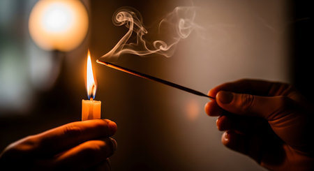 A hand holds an incense stick near the flame of a lit candle in a dark setting. Smoke rises from the incense. The scene is lit by the warm glow of the candle flame.