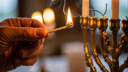 A person lights a candle on a candelabra using a matchstick in a religious setting