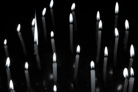 Many christmas candles burning at night on the black background. Candle flame set isolated in black background.