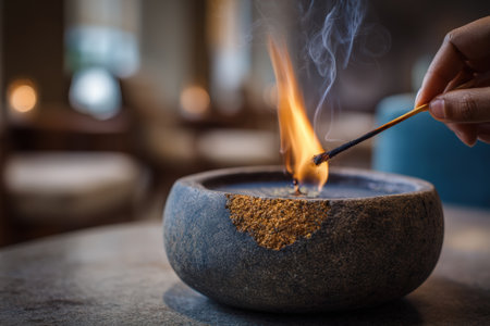 a hand holds a lit match, igniting a candle. the candle sits in a rustic stone bowl, with a visible flame and rising smoke. the scene evokes warmth and relaxation with a soft, blurred background.