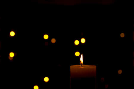 Candle flame light at night with abstract circular bokeh background Christmas lights.