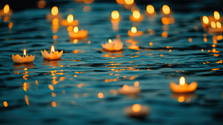 A peaceful night scene showcasing floating candlelit lotus flowers on water, creating a serene and tranquil atmosphere perfect for relaxation and meditation.