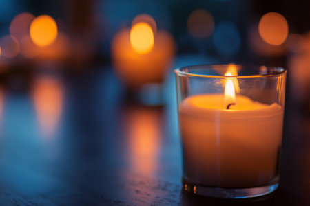 A tranquil scene featuring a lit candle casting a warm glow in a dim environment, perfect for creating a calming atmosphere and enhancing mood.