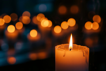 Soft light from flickering candles illuminates tranquil scene, inviting calming ambiance. Expression of regret, eternal memory and mourning. Religious ritual cult. Moments of reflection serenity. AI.