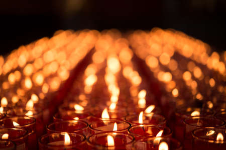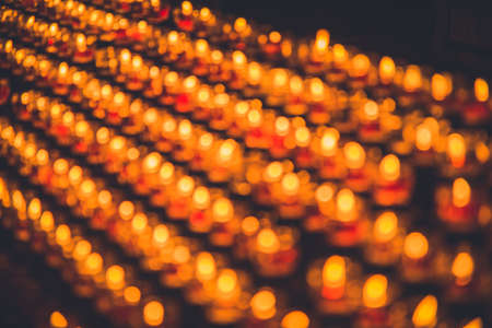 Close up of classic candle with orange flames burning on wax with bokey of other candles in church