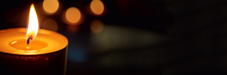 A single candle burns gently in the dark night, casting a warm glow and creating a serene, peaceful atmosphere. Perfect for banners or designs with copy space.