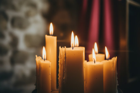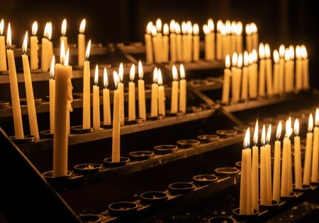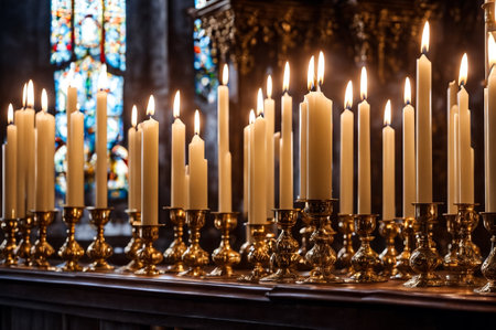 A group of lit candles illuminating a church. Perfect for religious or spiritual themes.