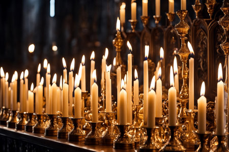 Close up of praying wax candles in orthodox church for ceremony easter. Burning candles easter burn in orthodox temples. Concept of church backgrounds. Copy ad text space. Gen Ai illustration