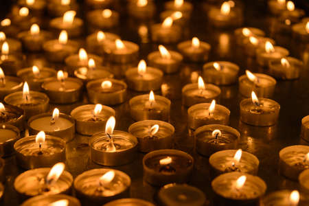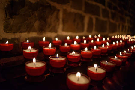 Close up of votive candles, twilight, in a dark Christian church. Selective focus