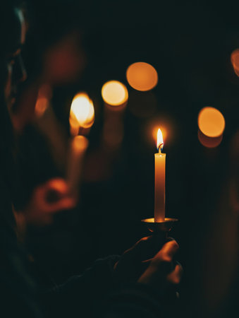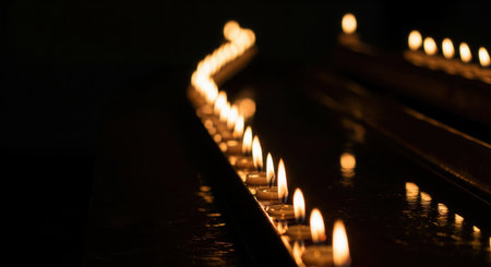 A photography of a candlelight vigil held in memory evoking a solemn and spiritual ceremony with glowing flames soft lighting and a contemplative reverent atmosphere
