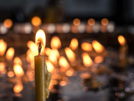 Candle lights in a Church in The Netherlands. Candle with golden flame burning for hope.