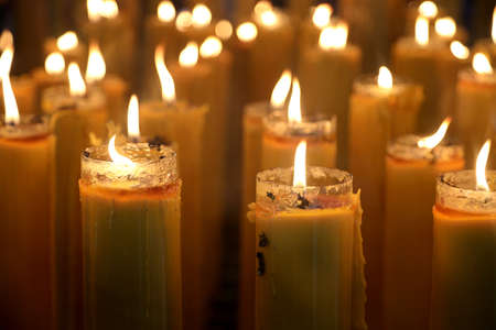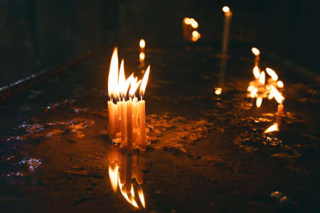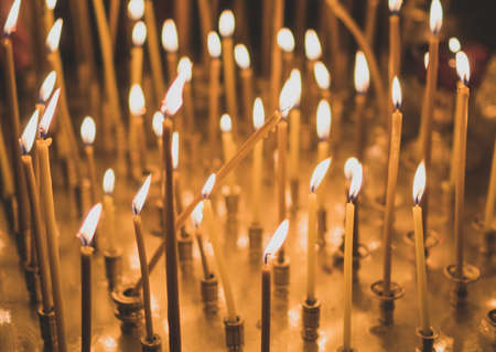 Praying wax candles in orthodox church or temple for ceremony easter. Background burning candles easter burn in orthodox temples. Concept of church backgrounds for creativity. Copy ad text space