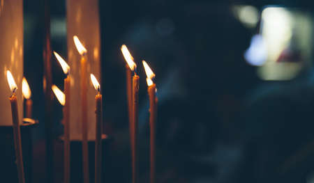 Praying wax candles in orthodox church or temple for ceremony easter. Close up burning candles easter burn in orthodox temples. Concept of church backgrounds for creativity. Copy ad text space