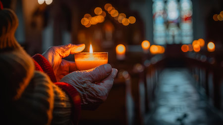 Person in a church setting holding a lit candle, suggesting participation in a religious ceremony. The scene captures a moment of reflection or prayer