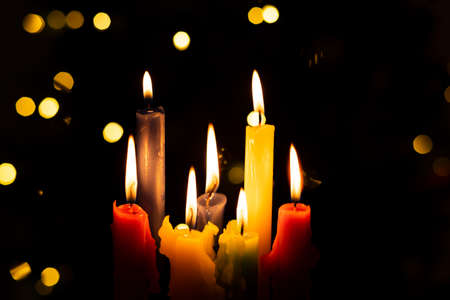 Candlelight Day. Traditional Colombian holiday. Group of colored candles lit at night with unfocused lights in the background. Copy space.
