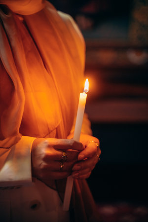 Details with the hands of an old woman lighting a candle inside a christian orthodox church in Romania.