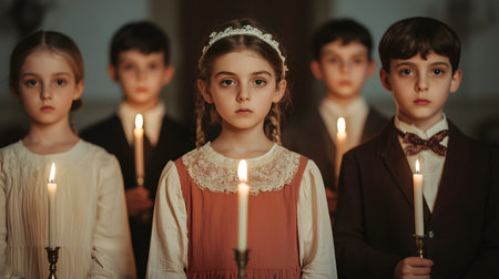 A poignant scene of children holding candles, showcasing solemn expressions among soft candlelight. Background subtly blurred, exuding a warm, reverent atmosphere of tradition.