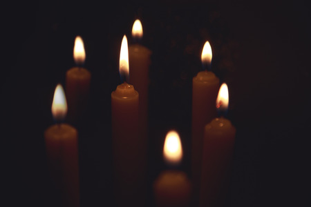 Yellow Candles Burning in the Dark with lights glow. The burning candle's flame is in the dark background.