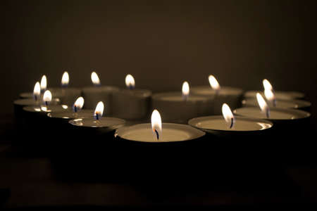 burning memorial candles on the dark background. many round memorial candles in the candlesticks. Burning fire on the candles standing on the table