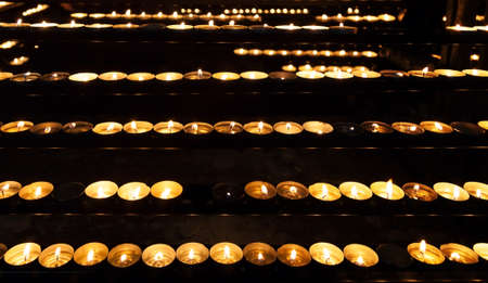 Burning votive candles warm glow in circular stand rack at french catholic cathedral church dark background. Prayer, hope, faith, remembrance prayer spirit in tranquil atmosphere