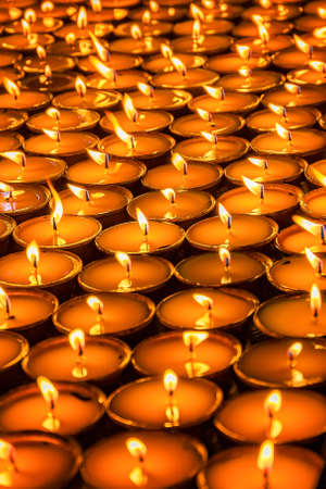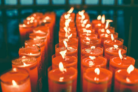 Close up of classic candle with orange flames burning on wax with bokey of other candles in church