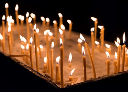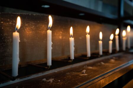Slow burning wax candles in church as a symbol of death memory. Dark macro close composition with shallow depth of field.