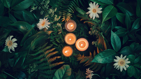 Candles glowing softly among flowers, leaves and stones in natural setting