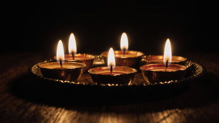 An intimate, moody still life of a Diwali thali illuminated solely by the warm glow of oil lamps, creating a sacred and atmospheric feeling of celebration.