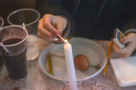 Woman lighting a candle with a matchstick. Close up. Selective focus.