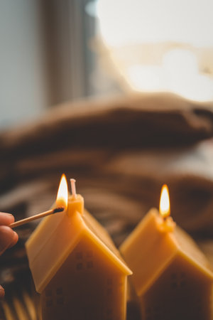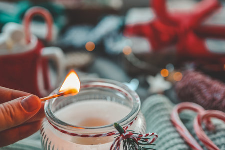 Hand with a match lights a candle, Christmas aesthetics.