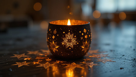 a candle glows warmly inside a star patterned holder, casting shadows on the dark surface
