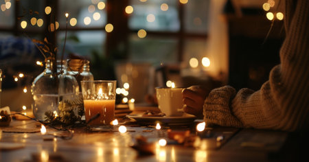 A warm and cozy atmosphere with candles and string lights adding to the ambiance as participants work on their projects with glasses of hot apple cider or ed chai tea