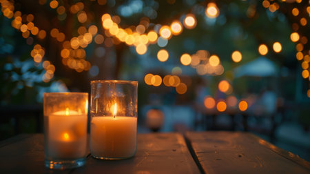 Candles on a wooden table in a street cafe in the evening