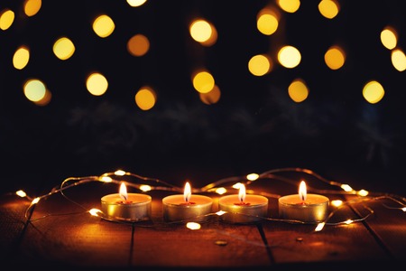 Four candles on a wooden background with Christmas lights
