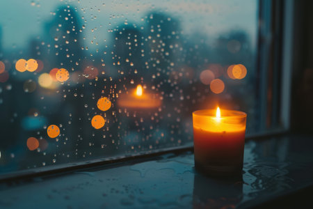 Burning candle on window sill with raindrops on glass and blurred city lights at night. Concept of cozy atmosphere, relaxation and rainy evening