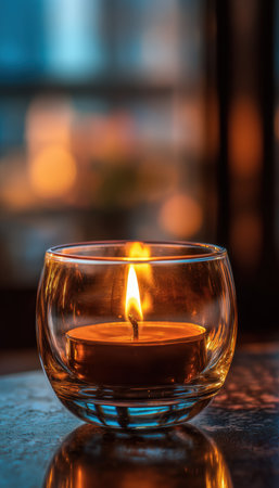 A simple candle flame reflects in a glass holder, creating a serene and warm atmosphere. The soft glow and warm tones evoke a peaceful and calming mood.