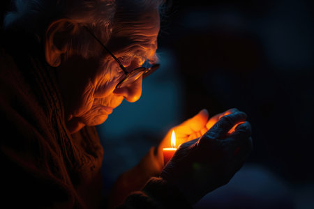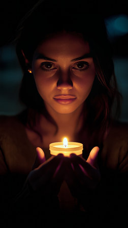 A woman softly illuminated by a candlelight holds a small candle close to her face, evoking a sense of tranquility and contemplation in a dark environment.