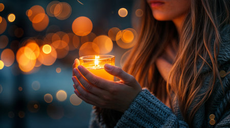 Woman holding a candle with bokeh lights in the background