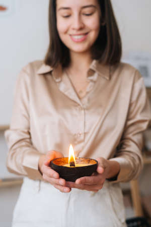 Vertical portrait of cheerful young woman holding burning scented handmade candle in palms. Front view of female holding aromatic relaxing candle at home. Concept of wellness and relaxation.