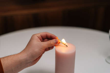 Close-up high-angle view of unrecognizable man lighting large white candle with match at table in dark living room, selective focus. Love couple celebrating anniversary or Valentines day.