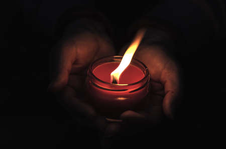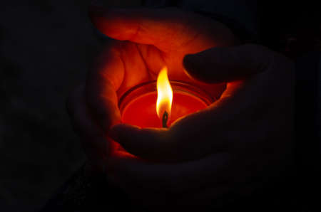 A red burning candle between a womans palms. The woman shelters the candle flame from the wind outside. Defocus, blur, noise, grain effect.