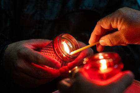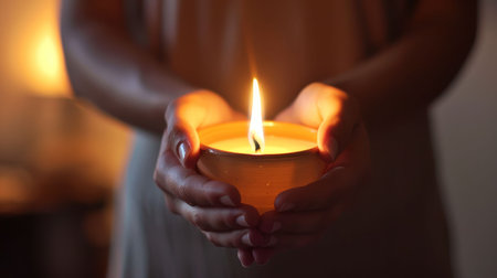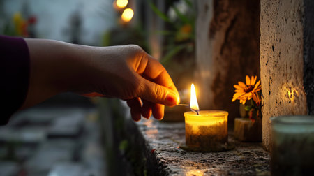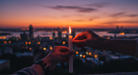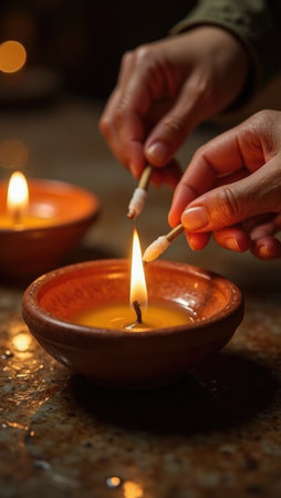 A powerful moment of ignition: hands light a traditional oil lamp, symbolizing hope and victory of light over darkness. The warm glow creates a serene, spiritual atmosphere.