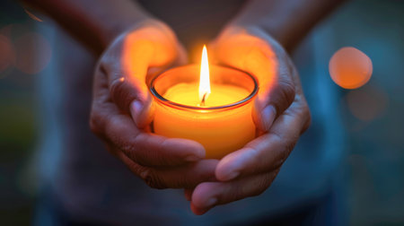 Hope in the Dark, Close Up of Hand Holding Candle in Blue Atmosphere, Unity and Solidarity Concept