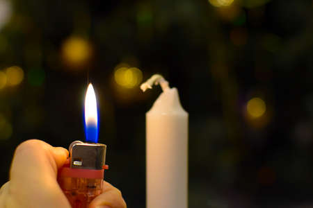 lighting a candle with a lighter. burning candle in the dark