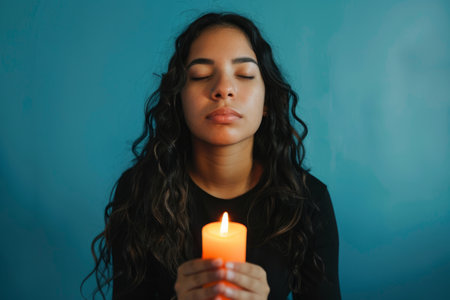 a young Hispanic woman praying with a candle: She sits with a lit candle in front of her, eyes closed in contemplation on a blue studio backdrop
