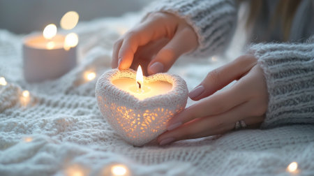 Close up of Caucasian female hands placing a candle in a crochet holder. Concept of warmth, cozy winter decor, tranquil ambiance for relaxation.