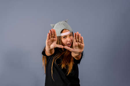 funny girl in an orange sweater in blue caps hand gesture Lifestyle unaltered